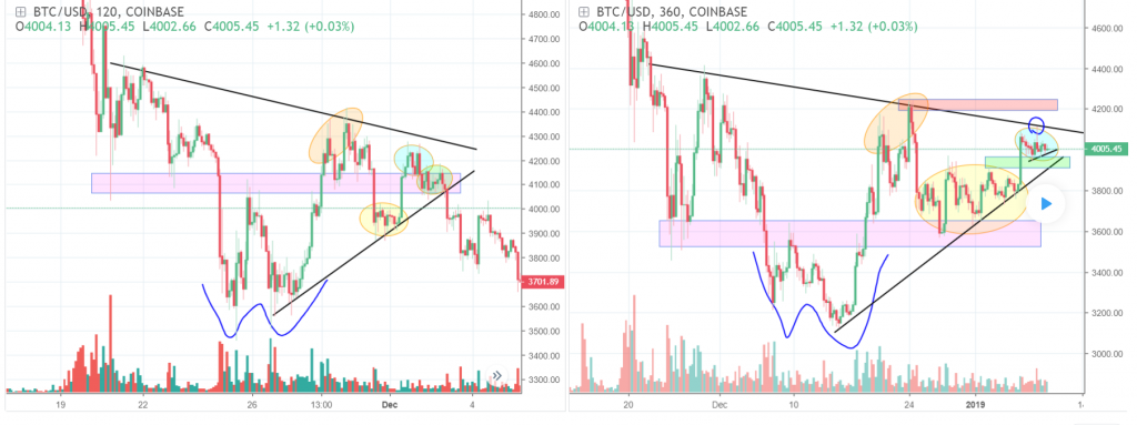 For now, it’s important that Bitcoin’ holds the 4000/3950 level, so alts don’t loose ground and bulls don’t get scared. But knowing how this market works (usually), there is a big chance we might see a shake out to 3800/3850 and bounce back up again. This is likely, because volume is still low which makes it very easy to force such a move. So day trading this is not easy, almost gambling. Moments like these, you need to have your position already and believe in your long or short positions. I was short, my stop would be around 4200 and if i was long my stop would be around 3800. Anything in between is noise, one shake out after the other. The black upwards trend line is also important to watch, of course taking wicks into account, that trend line should not break.